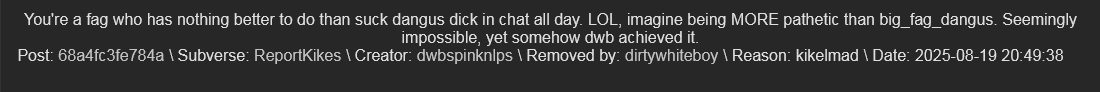 You're a fag who has nothing better to do than suck dangus dick in chat all day. LOL, imagine being MORE pathetic than big_fag_dangus. Seemingly impossible, yet somehow dwb achieved it.
